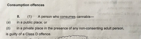Section 8(1)(a) classes consumption of cannabis in public as a class D offence which is 2 years and/or a fine. Oh and if you have a complaining aunty, don’t smoke in private around her either – 8(1)(b) is for the non-consenting adult in private. Other than Aunty Gladis – you can light up at home gerus.